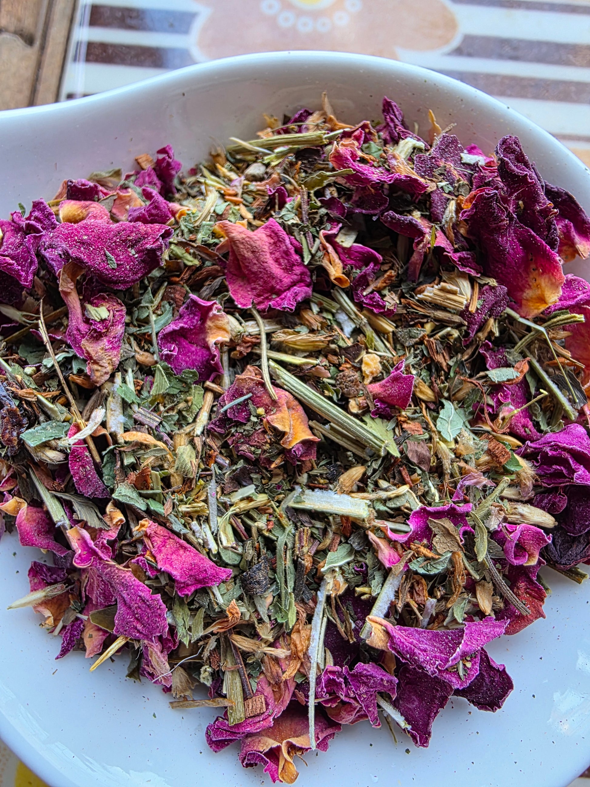 Ingredients: Rose Petals, Cardamom, Green Rooibos, Lemon Balm, Orange Peel, Rosehips, Honeybush, Red Rooibos, Red Clover Flowers